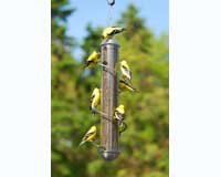 17 in. Metal Spiral, 17.5 in. Aluminum Thistle Spiral Feeder. Consumers & birds LOVE patented BirdQuest Spiral Feeders! More ports means more birds. Birds love to Run The Spiral instead of flying to another perch. Lifetime warranty on workmanship and normal wear and tear. Aluminum and stainless steel parts. Squirrel-proof- patented locking lid- just twist and lock those pesky varmints out. Easy to clean- twist and clean (patent pending) easy-clean bottom comes completely off for easy cleaning. This allows you to fill from the top one time and the bottom the next. This means seed never gets old or moldy. That equals more finches at all the ports. Also makes cleaning a snap. No screws to mess with. Easy to hang- looped wire hanging cable included (150 lb test) and attached. Holds cap so you don't have to wonder where you put it. 2.5 Quart capacity (1.5 pounds). Tray in image is sold separately.