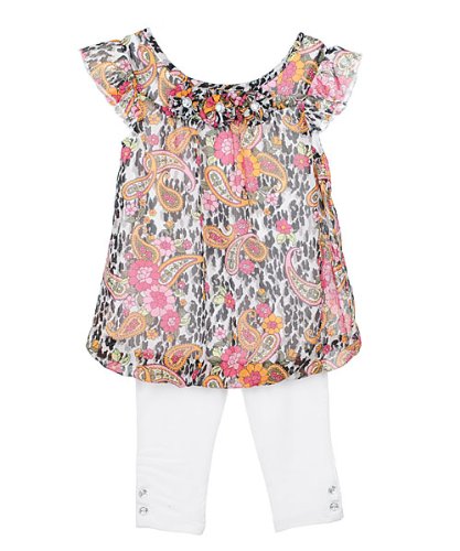 Pogo Club "Paisley, Give her girly style and all-day comfort with this trendy 2-piece from Pogo Club! The chiffon tunic features an A-line cut, flutter sleeves, bejeweled rosettes at the chest, and a bubble hem. The chiffon exterior has a leopard and paisley print and a full lining. The matching leggings feature an elastic waistband and prismatic buttons on the cuffs. Tunic 100% Polyester Leggings 57% Cotton, 38% Polyester, 5% Spandex Machine Wash Cold Made in Vietnam
