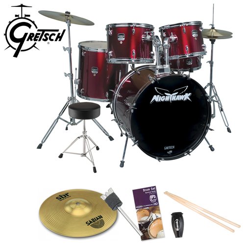 Gretsch , Sizes: 15x22 Bass Drum, 9x12, 10x13 Rack Toms, 16x16 Floor Tom, 5-1/2x14 matching wood Snare Drum. Hardware: Includes Bass Drum Pedal, Snare Stand, Hi-Hat Stand, (1) Straight Cymbal Stand (all stands are double-braced). Floor Tom includes brackets & legs. Drum Throne: Height adjustable with padded seat. Cymbals: Brass 14" High-Hat (Pr.), 16" Crash. Shells: 9-Ply cross laminated select hardwoods. Bass Drum: Key Rods with upgraded telescopic spurs. Bass Hoops: Black Metal. Heads: Remo UX Drum heads Black front bass drum with Nighthawk logo. Coated white snare batter. All others are clear. Sticks: Wood tip 5A size. Finish: Wine Red.Includes Hardware, Drum Throne & Cymbals - Bonus! Also, includes Evans Drumset Survival Guide, LP Rumba Shaker (LP201BK), Sabian 10" SBR Splash Cymbal (SBR1005) & Gibraltar Splash Stacker (SC-MSA6)
